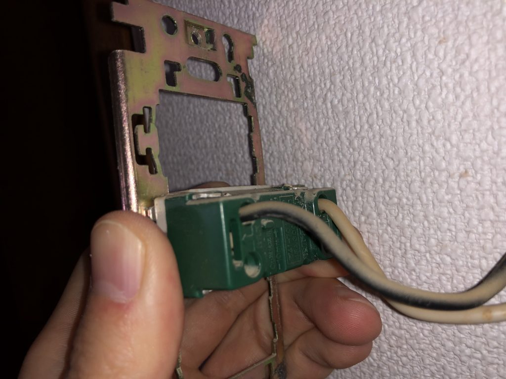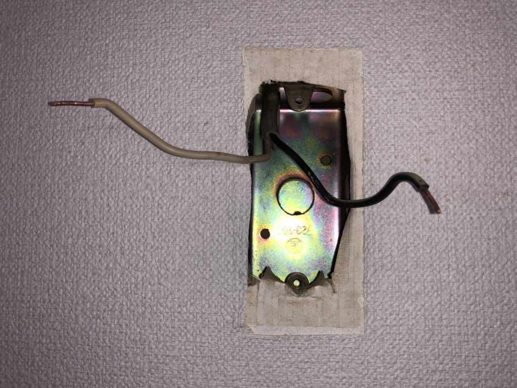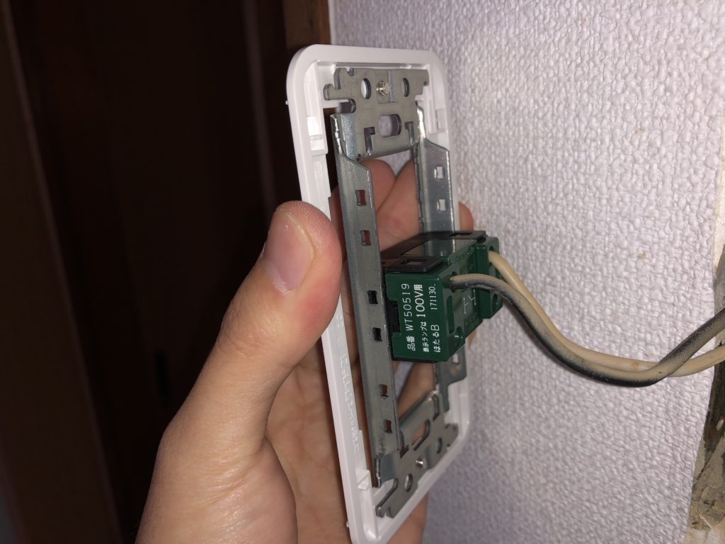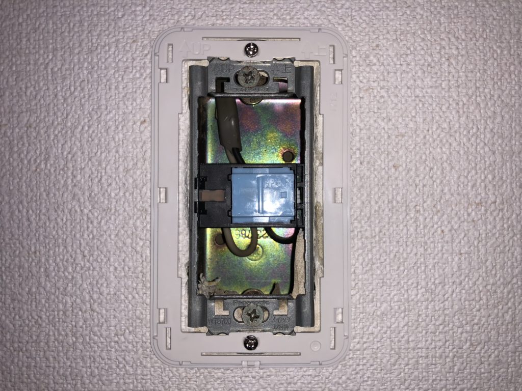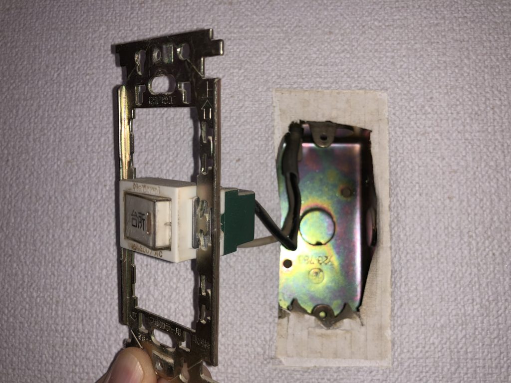 スイッチを引き出すと、壁の中に金属製のスイッチボックスが埋め込まれていることが分かります。このタイプは、スイッチ本体の取り替えが比較的簡単です。