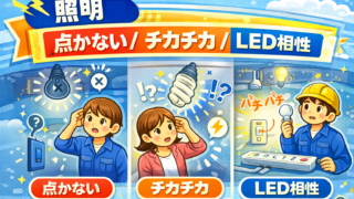 照明トラブルは「電球(LED)」「器具」「スイッチ」「回路」のどこが原因かで対処が変わります。危険サインがなければ、まずは電球交換が最短ルートです。